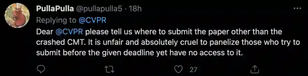 赶着DDL提交论文的同学义愤填膺地表示:「亲爱的CVPR,请告诉我们除了崩掉的CMT之外,还有哪里可以提交论文。要不然,在给定的截止日期前,却不能提交论文,这是不公平的,对赶论文的同学来说太残酷了。」