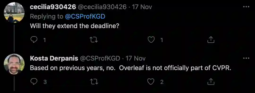不过,根据往年的经验,由于Overleaf不属于CVPR的一部分,所以遇到这种问题并不会延期。