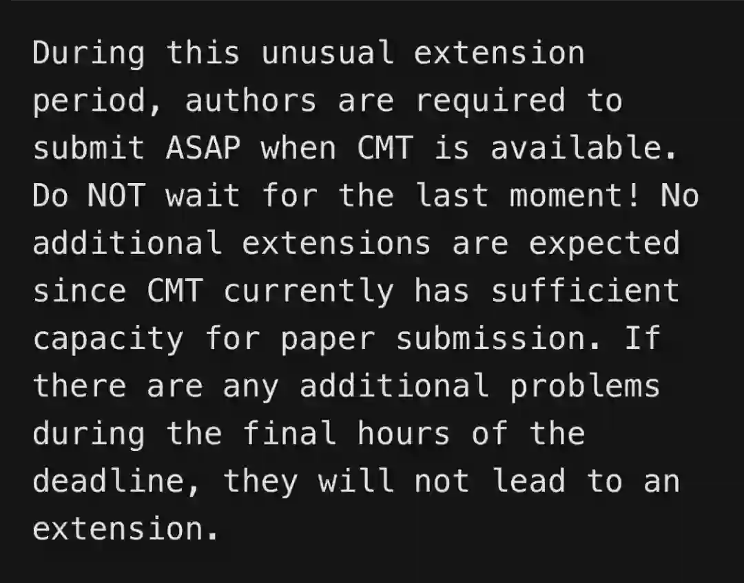 在这个不寻常的延长期,作者需要在CMT可用时尽快提交。请不要等到最后一刻!由于CMT目前有足够的能力可以接受论文提交,所以预计不会有更多的延期。如果在截止日期的最后几个小时有任何额外的问题,将不会再次延期。