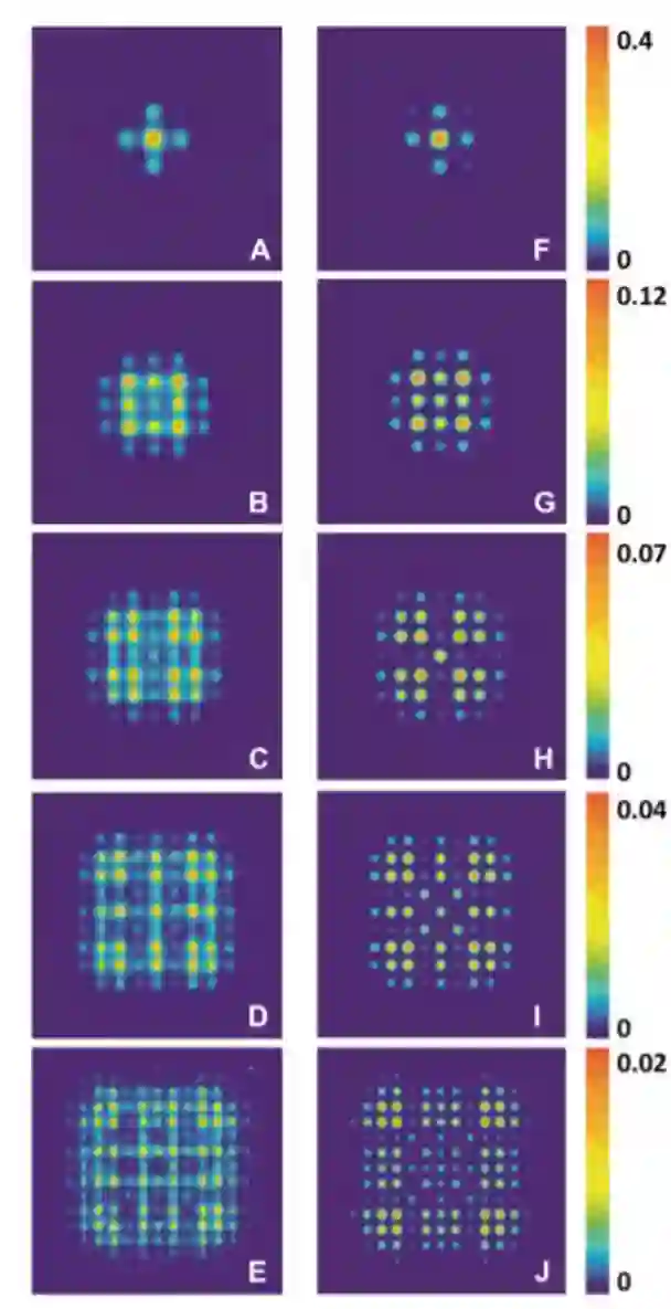 图三 | 概率分布:横纵轴分别对应两个维度,z轴为对应的单光子概率。(A到E)实验上得到的单光子概率分布。(F到J)理论概率分布。传播长度分别为:(A和F)1.81mm,(B和G)3.31mm,(C和H)4.81mm,(D和I)7.31mm,(E和J)9.81mm