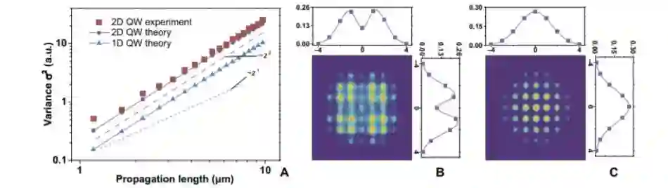 图四| 量子行走的输运性质。(A)一维量子行走和二维量子行走理论和实验方差与传播长度的关系。(B)传播长度为4.31mm的单光子二维量子行走概率分布。(C)1.5单位长度的理论经典随机行走概率分布