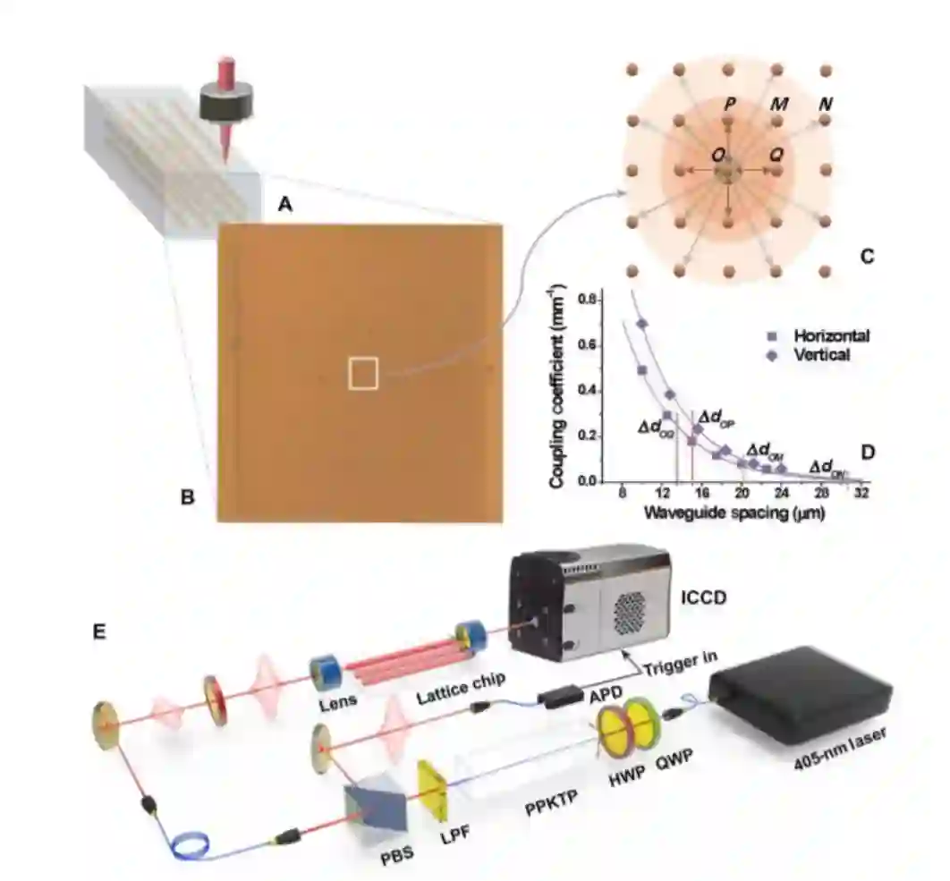 图二 | 实验装置示意图 (a) 飞秒激光直写技术制备的三维波导阵列。(b) 实验上所用到的光子晶格横截面。(c) 一个波导耦合另一个波导示意图。(d) 垂直和平行方向,两个波导耦合系数随着距离变化的变化趋势。(e)单光子实验装置。APD:雪崩光二极管。PBS:极化分束器。HWP:半波片。QWP:1/4波片。LPF:低通滤波器。PPKTP:周期极化KTP晶体