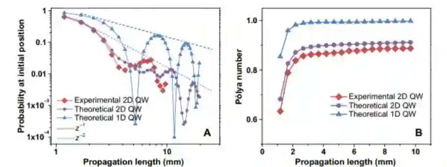 为了进一步比较不同维度量子行走的区别,该团队测试了传播长度和此时发现行走者处在初始位置的概率的关系。他们发现,所有的量子行走随着传播长度的增加,回到初始点的概率都会减少,但会有着不同的减少趋势,二维量子行走远离初始位置的速度更快,并且不太可能再回到初始点,这是二维量子行走和一维的一个很大的不同。并且,图5(B)发现二维量子行走的实验和理论都符合相同的趋势,这个趋势是连续二维量子行走的显著标志。