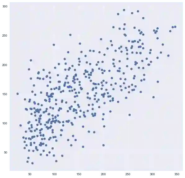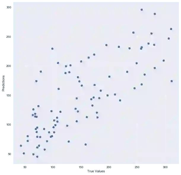 之前我们演示了用函数划分糖尿病数据集的结果,这里我们尝试对它做交叉验证,看看有什么不同。首先,我们可以用cross_val_predict函数返回测试子集中每个数据点的预测值。