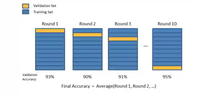在k-折交叉验证中,我们将数据分成k个不同的子集(分成k折),并在k-1个子集上分别训练单独模型,最后用第k个子集作为测试数据。