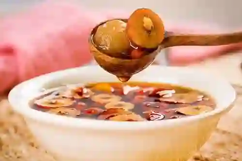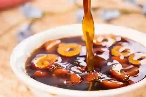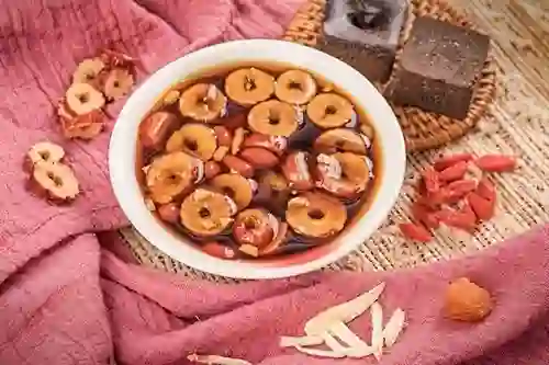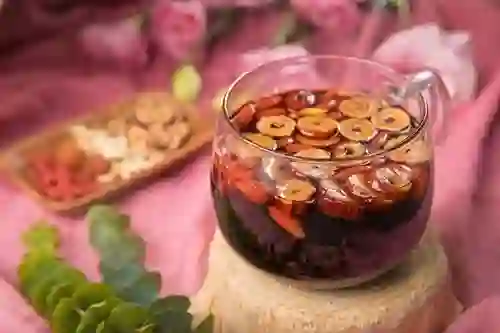 皮薄、肉厚、有嚼劲,里面有丰富的铁元素,红枣浸了黑糖水,也更香糯。