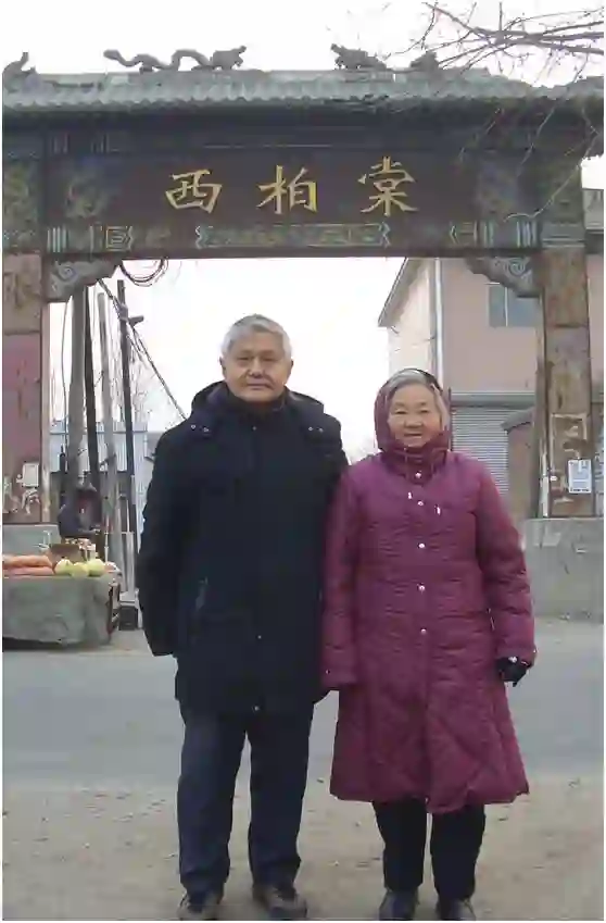 ▲回老家——2010年郝柏林、张淑誉摄于河北正定西柏棠村村口