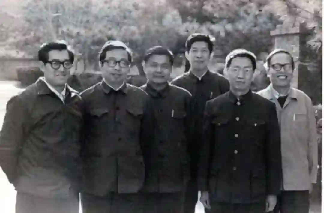 ▲1980年当选时不满50岁的6位学部委员(左起)曲钦岳、方励之、郝柏林、杨乐、高庆狮、姜伯驹,摄于1982年