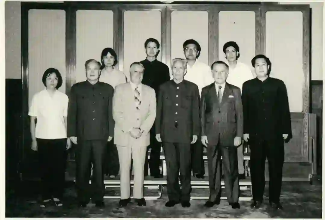 ▲1979年8月22日王震副总理(左4)接见诺贝尔化学奖获得者普利高津(左3),左2为中国科学院副院长钱三强,后排左3为郝柏林
