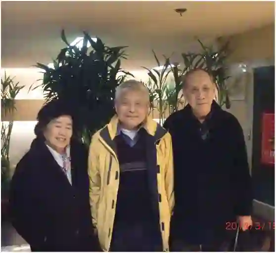 1940年在重庆沙坪坝进入中央大学附属小学一年级的金作怡、郝柏林和毛士艺2014年3月在北京聚会时合影, 他们的父亲分别是中大农学系教授金善宝、森林系教授郝景盛、园艺系教授毛宗良