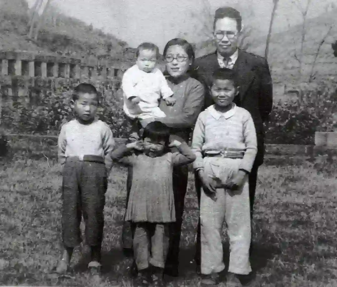 前排左起郝松林、郝杉林、郝柏林,后排左起母亲赵为楣抱小妹郝小虎,父亲郝景盛。郝景盛时任迁往昆明的北平研究院植物所所长,大部分时间在北碚安心著述。
