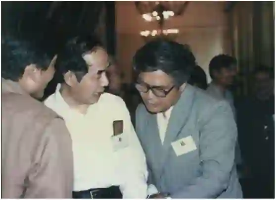 ▲1986年郝柏林(左3)与李政道(左2)在格点规范场会议上