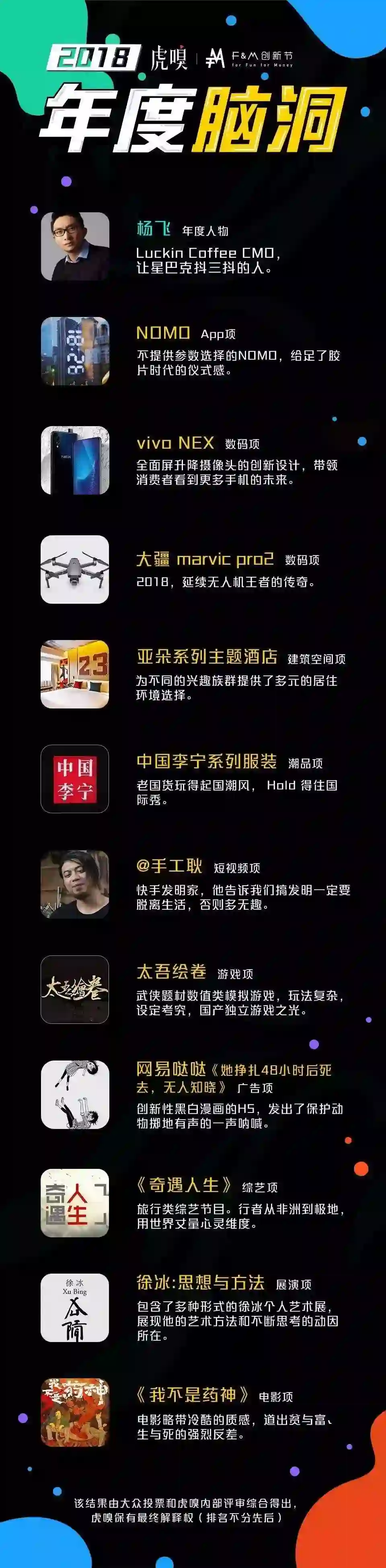 为了更精确地评选,今年我们将脑洞奖细分为若干细项,包括APP项、数码项、智能汽车项、建筑空间项、潮品项、短视频项、综艺项、电影项、游戏项、广告项、展演项、年度脑洞人物等,最后,除了智能汽车项落空(我们评委表示,实在不能在本年度本土智能车产品中找到令人心动与折服的产品创新),其他项均名花有主。