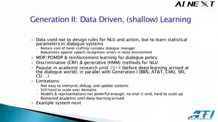 从业者不愿意把这代技术称之为浅层学习(shallow learning),但事实如此,它们是传统的浅层学习方法。对了,用于对话规则(dialogue policy)的强化学习就是这时候研究出来的(1990 年代)。今天我们看到的强化学习高潮,在那时就打下了基础。如今深度学习的进步进一步起到了帮助。