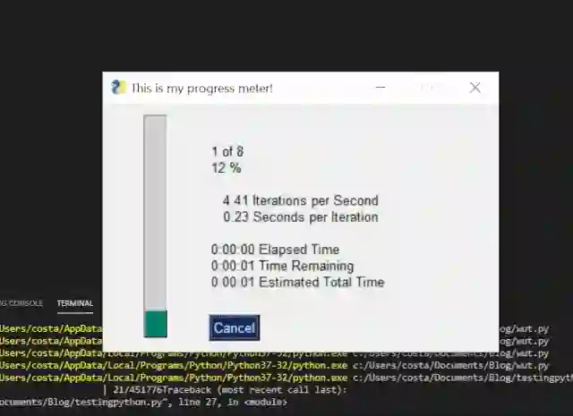 import PySimpleGUI as sgimporttimemylist = [1,2,3,4,5,6,7,8]for i, item in enumerate(mylist):sg.one_line_progress_meter('This is my progress meter!', i+1, len(mylist), '-key-')time.sleep(1)