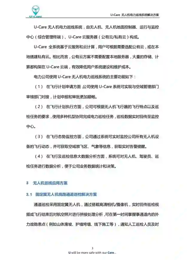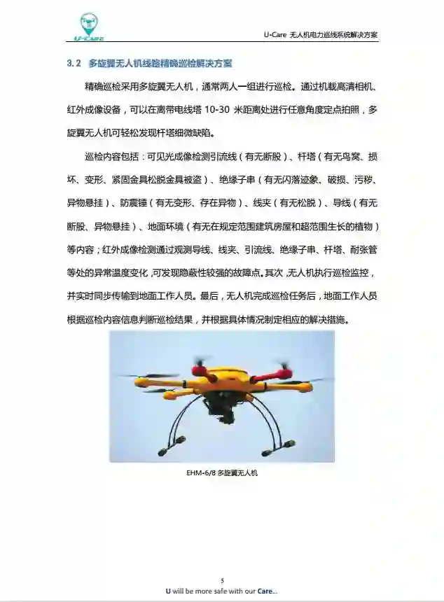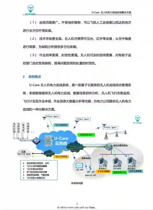 U-Care无人机电力巡线系统,由无人机、无人机地面控制器、运行与监控中心(综合管理终端)、U-Care云服务器(公有云/私有云)构成。