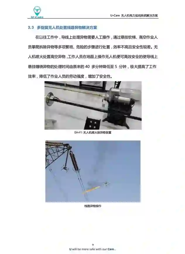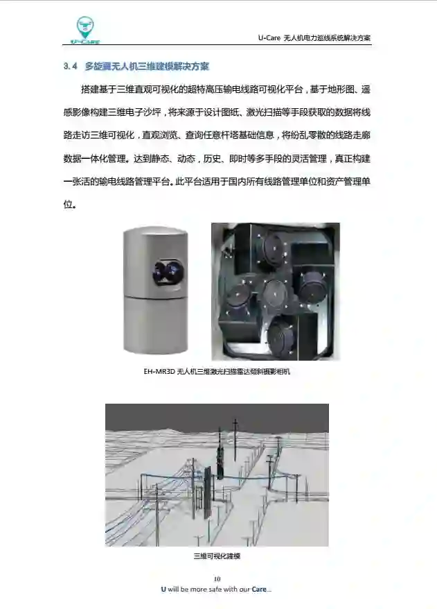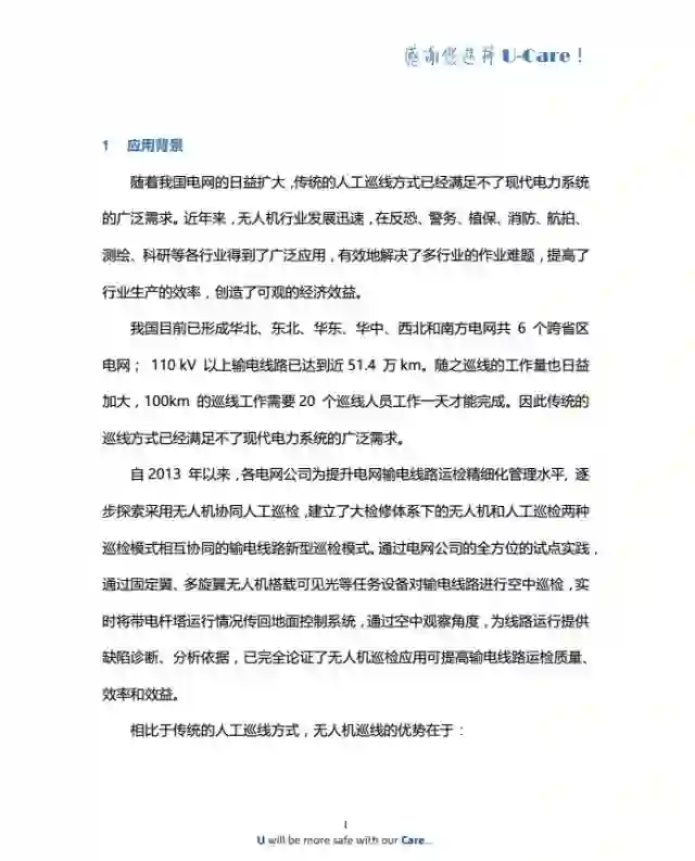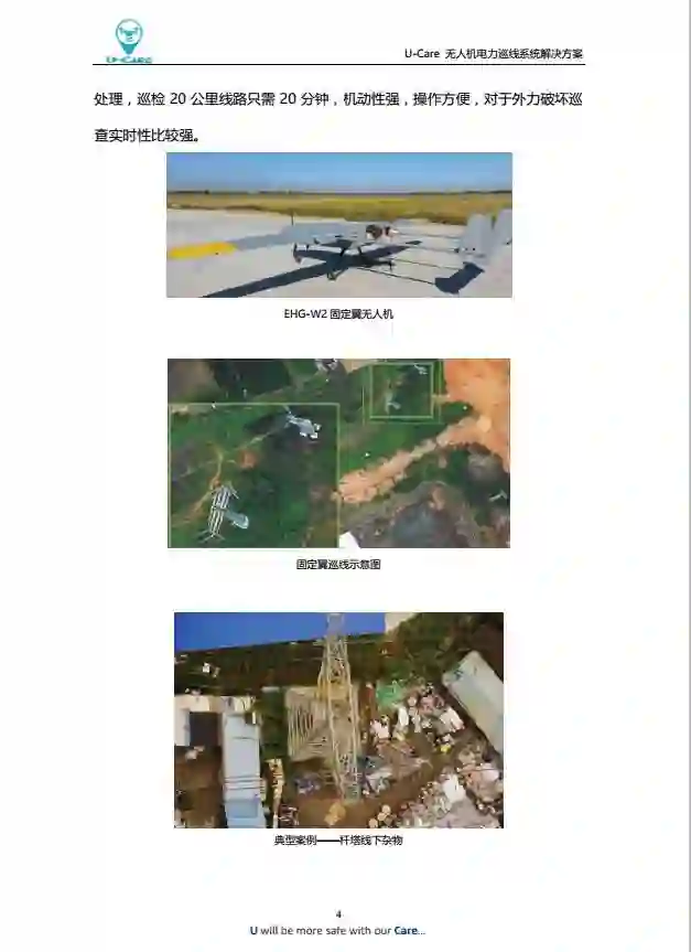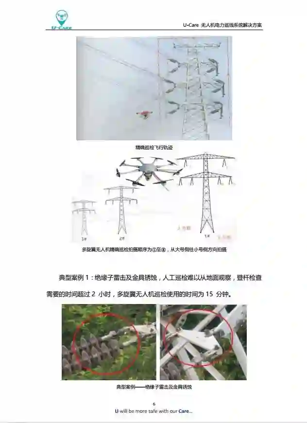 U-Care无人机电力巡线系统是一款基于云服务的无人机巡线综合管理系统,系统能够提供无人机电力巡线、数据信息回传分析、无人机飞行态势监控、飞行计划及作业申报、作业信息大数据分析等功能,为电力公司提供无人机电力巡线一体化解决方案。