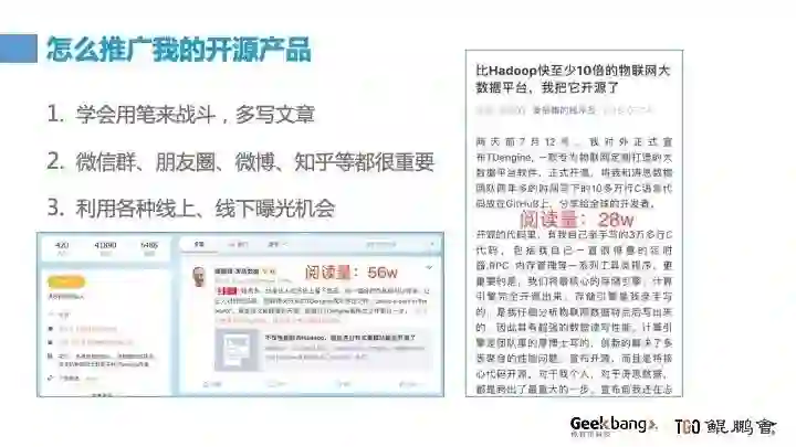 第一个是要学会用笔来战斗,多写文章。为了推广 TDengine 我写了十几篇文章,比如 7 月 12 号宣布开源的时候,我写的微信文章达到了 28 万的阅读量;今年集群开源,宣传微信阅读量接近 10 万,微博的阅读量已经是超过 56 万,现在还有人在转载。文字流量带来的影响力很大。