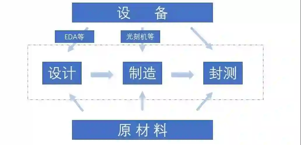此外,在芯片产业链中的设备和原材料两个环节,国内企业更是严重缺失。