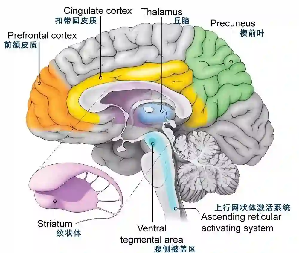 这个观点不仅完全反驳了弗洛伊德的理论,也与经典的“皮层为意识之源”的观点相悖。索姆斯认为,这些高级脑区并不是意识的主宰,而是通过接收脑干和中脑里更深层结构的“命令”来工作的。他还认为意识来源于掌管警觉、感情刺激和欲望的脑区——正好是弗洛伊德主张的无意识区域(见下方大脑插图)。他说:“大脑皮层的规律检测机制,在没有意识参与的情况下,效率最高。更深层的情感脑区,即边缘结构,才是意识的真正发源地。”