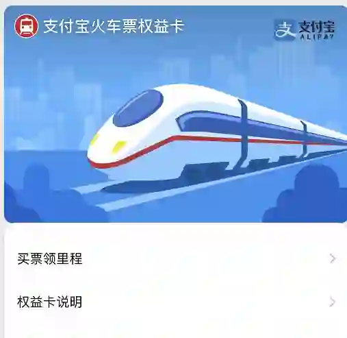 用户在支付宝内可领取“支付宝火车票权益卡”,加入支付宝铁路里程计划,之后使用支付宝在12306官网、客户端、火车站窗口、自助售票机购买火车票,除了积累铁路会员积分外,均可以获得相应里程积分。