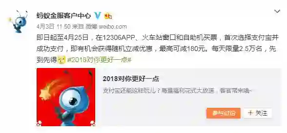 昨日,蚂蚁金服客户中心发布微博表示,“即日(4月3日)起至4月25日,在12306APP、火车站窗口和自助机买票,首次选择支付宝并成功支付,即有机会获得随机立减优惠,最高可减180元。每天限量2.5万名,先到先得。”