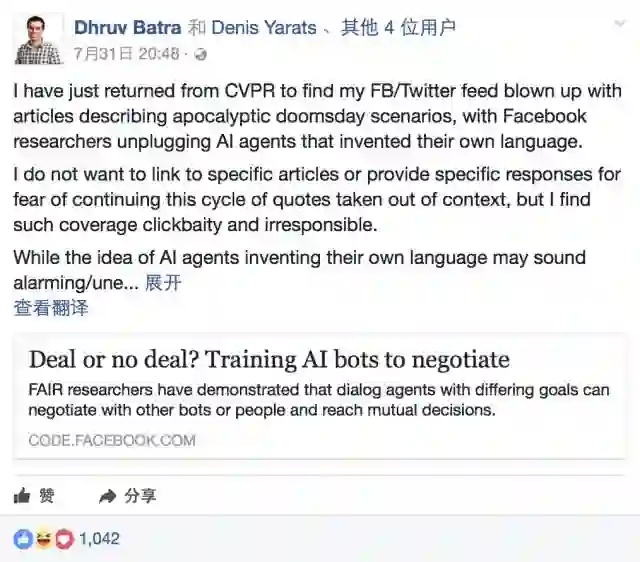 Dhruv Batra称这些断章取义的报道是“标题党并且不负责任”。他在Facebook上发文称: