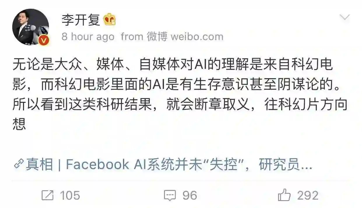 “大众以及部分媒体、自媒体,对AI的理解很多来自科幻电影,而科幻电影里面的AI超级智能,是有生存意识甚至阴谋论的。所以看到这类科研结果,就会断章取义,往科幻片方向想。” 创新工场(chuangxin2009)董事长李开复说。