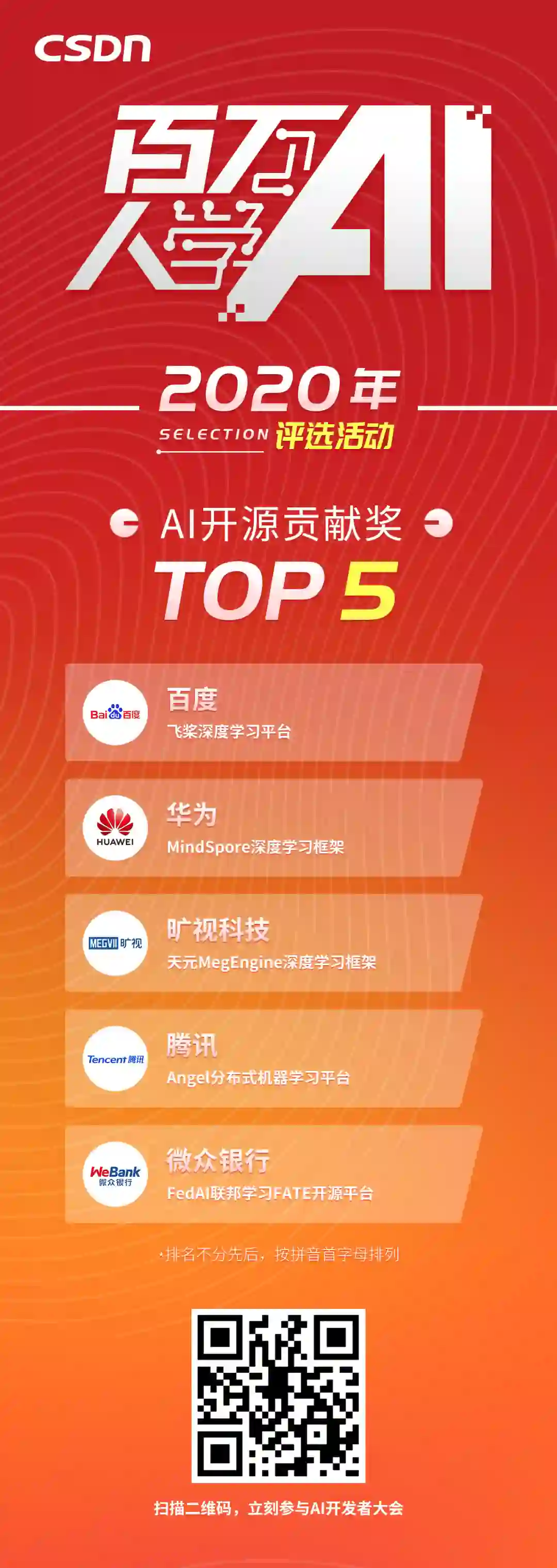 2020 年无疑是特殊的一年,AI 在开年的这场“战疫”中表现出惊人的力量。站在“新十年”的起点上,CSDN发起【百万人学AI】评选活动。我们继续聚焦AI的技术落地,关注开源和新生的力量。