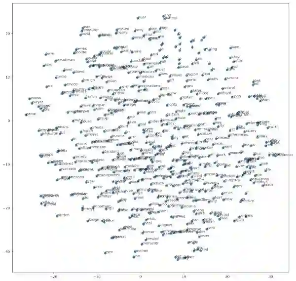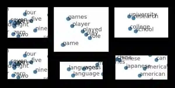 上面的图中通过TSNE将高维的词向量按照距离远近显示在二维坐标系中,该图已经在git库中,想看原图的小伙伴去git看~