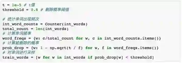 上面的代码计算了样本中每个单词被删除的概率,并基于概率进行了采样,现在我们手里就拿到了采样过的单词列表。