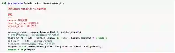 我们定义了一个get_targets函数,接收一个单词索引号,基于这个索引号去查找单词表中对应的上下文(默认window_size=5)。请注意这里有一个小trick,我在实际选择input word上下文时,使用的窗口大小是一个介于[1, window_size]区间的随机数。这里的目的是让模型更多地去关注离input word更近词。