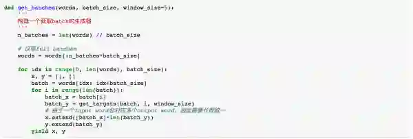 我们有了上面的函数后,就能够轻松地通过input word找到它的上下文单词。有了这些单词我们就可以构建我们的batch来进行训练: