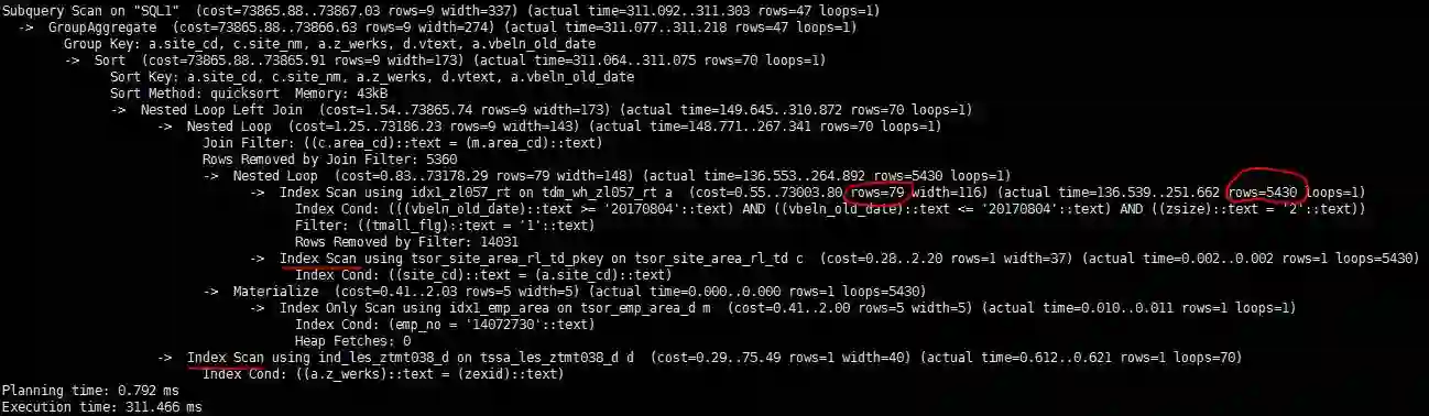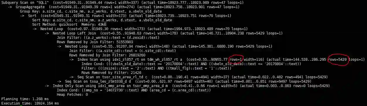再仔细看下执行计划里的cost估算,发现PG估算出的rows只有1行,而实际是5429(图中红线部分)。看来是行数估算的巨大偏差导致PG选错了执行计划。