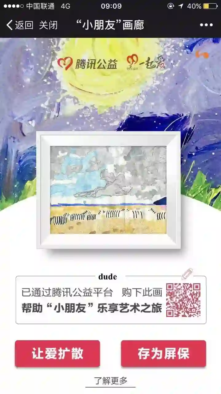 用户每购买一副自闭症儿童的电子画作,就相当于向腾讯公益平台上的“用艺术点亮生命”公益项目进行了捐赠。