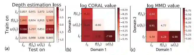 下图4×4的矩阵表示了从Gibson迁移到真实场景的评估分数,(a)表示所有训练测试结合的深度估算错误;(b)(c)表示MMD和CORAL分布的距离。