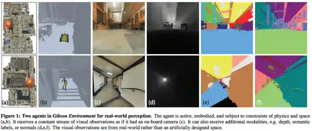 为活动的智能体创建视觉感知模型并进行感觉运动控制是非常困难的,因为目前的算法较慢,无法进行高效的实时学习,而机器人成本较高,也很脆弱。这就催生了“在模拟中学习”的方法,随之而来的问题是,结果能否转移到现实世界。在这篇论文中,我们研究了在活动的智能体上对现实世界进行感知,并提出了Gibson虚拟环境,展示了从中学到的样本感知任务。