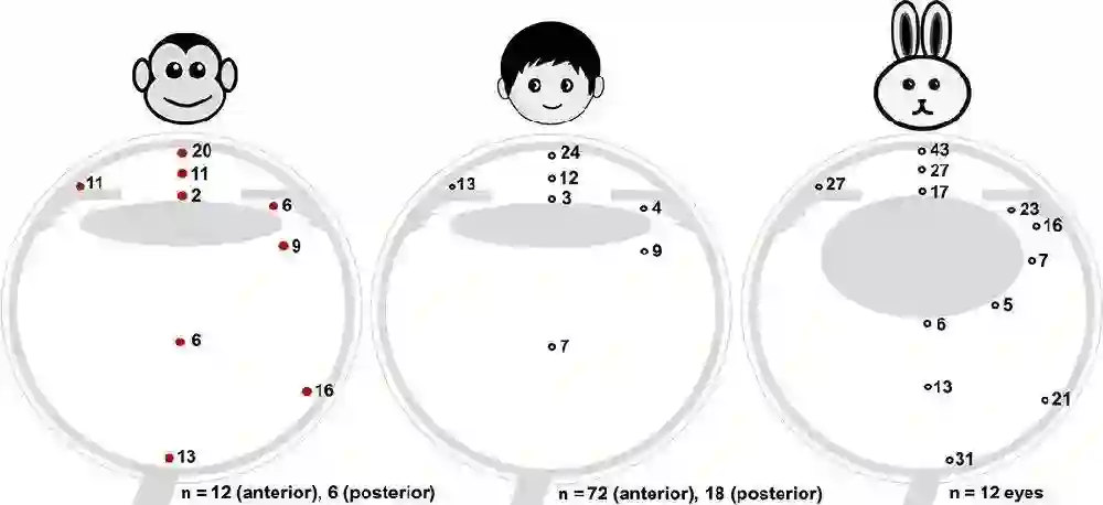 上面这图是先后历时15年来自4个不同课题(人,兔和猴)研究结果的综合比较。别误会我们将好玩的东西放进论文意味着该论文的严肃性和严谨性有所减低。本次实验因为是用恒河猕猴,不仅动物获得和批准不易,单就猴子年龄须均超过20岁就极难,所有手术均由该领域眼科专家教授分别实施。20岁猴子的年龄类似人类50岁但体型如1~2岁左右婴儿,故手术需要特别小心,眼内植入人工晶体都是特制小号。哪怕如此小心翼翼,第一例手术因没有经验忽视了猴眼与人眼的差异,让精通人类手术的专家遭遇滑铁卢而失败,痛失宝贵一例。更何况做这个课题时第一作者差点丢了命(见先前博文 差点儿挂了!)。