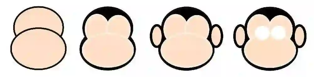 所以,写不下去的时候,本人干脆让脑细胞放空,自娱自乐地用PowerPoint的图形工具画图玩,后来发现可以组合不同图形画出卡通人物,再用Photoshop工具修饰一番,感觉还像模像样,下面看看一个猴子卡通的诞生,好玩吗?