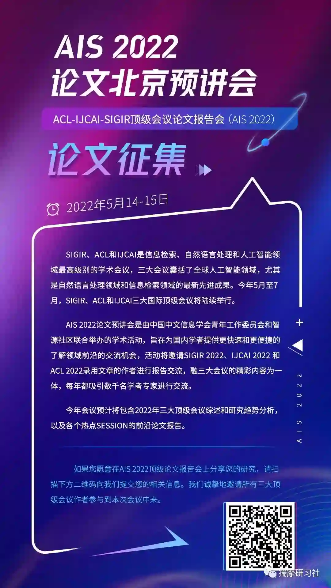 AIS 2022论文预讲会是由中国中文信息学会青年工作委员会和智源社区联合举办的学术活动,旨在为国内学者提供更快速和更便捷的了解领域前沿的交流机会,活动将邀请SIGIR 2022、IJCAI 2022和ACL 2022录用文章的作者进行报告交流,融三大会议的精彩内容为一体,每年都吸引数千名学者专家进行交流。