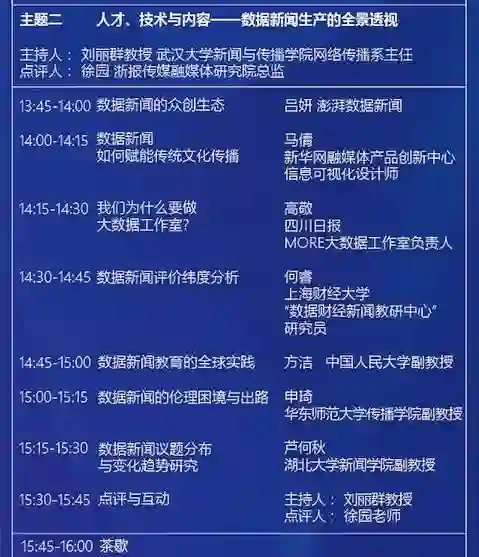 主题二:人才、技术与内容——数据新闻生产的全景透视,该主题将从新闻生产学的角度出发,关注数据理念和技术变化在新闻生产全链条中产生的影响,关注在人才培养、生产流程等环节需做出的回应与调试;