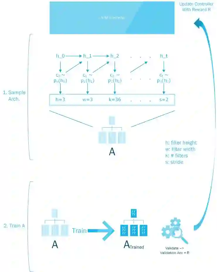 控制器在每个时间步长所做出的决定都非常有限。这些决定相当于是从一组过去被认为是在循环或卷积架构上表现很好的选项中选择出来的。例如,针对滤波器宽的选项是 [1,3,5,7],它们是已在 ResNets 或 DenseNets 等模型中应用的标准值。因而,搜索空间本身存在此类偏差,以至于很难去对表现糟糕的架构采样。