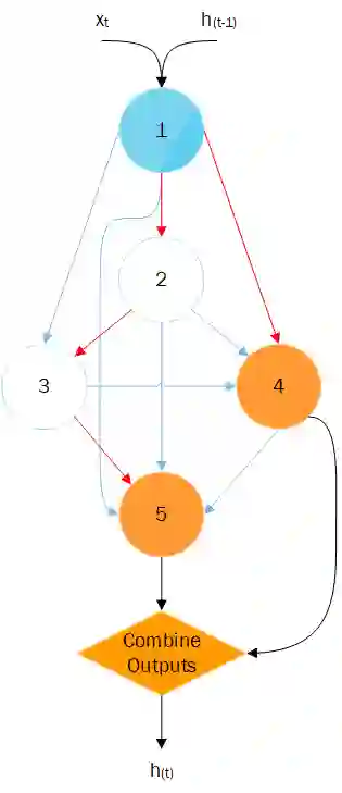 通过下图,大家可以非常好地理解该采样过程。回顾一下,在 NAS 示例中,我展示了如何创建整个 CNN 架构。在这里,我将聚焦单个循环单元。而在 ENAS 环境中的单元基本上仅为一个有向无环图(DAG),如果预先设定 DAG 中的节点数,则它只需要学习连接。DAG 可以被视作一个计算图,其边缘表示将信息从一个节点传送到另一个节点的矩阵乘法,以及表示不同「隐藏状态」的节点。