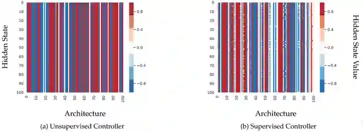 下图显示了 100 个采样架构的 RNN 控制器的隐藏状态(每行对应于单个架构的控制器隐藏状态)。请注意,在(a)中,即使采样架构不同,所有行也都是相同的,这表明控制器在隐藏状态下,不会对架构选择进行编码。