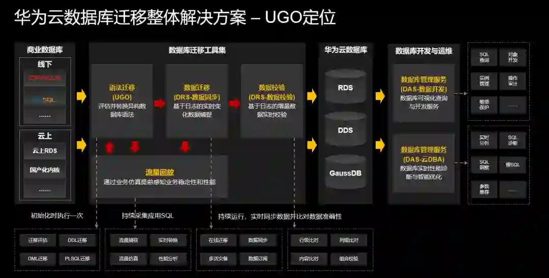 应用SQL迁移:通过采集源库SQL流量、SQL动态转换,将数据通过流量仿真回放形式迁移到目标库中,提供性能分析报告并输出SQL翻译报告,完成应用改造,迁移到目标库。