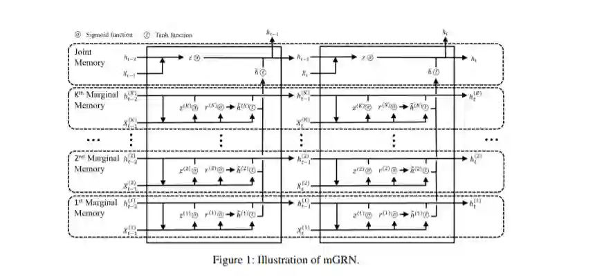 多元序列学习的本质是如何提取数据中的相关性。这些数据集,如重症监护病房的每小时医疗记录和多频语音时间序列,通常不仅在个别成分中表现出强烈的序列依赖性(“边缘”记忆),而且在横剖面依赖性中也表现出不可忽略的记忆(“联合”记忆)。由于联合分布演化的多元复杂性是数据生成过程的基础,我们采用数据驱动的方法,构建了一种新的循环网络结构,称为记忆门控循环网络(mGRN),门显式地调节两种不同类型的记忆:边缘记忆和联合记忆。通过对一系列公共数据集的综合模拟研究和经验实验的结合,我们表明我们提出的mGRN架构始终优于针对多元时间序列的最先进架构。