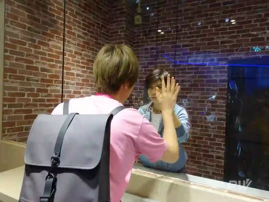 玻璃墙内有一位长得很像游戏里走出来的人物的小哥哥,体验观众可以把手放在玻璃上,感受对面放过来的一对一深情对视。观察了一会,大部分女生无法坚持 5 秒以上的对视。据悉,这也是 b 站即将上线的一款养成类游戏「无法触碰的掌心」。