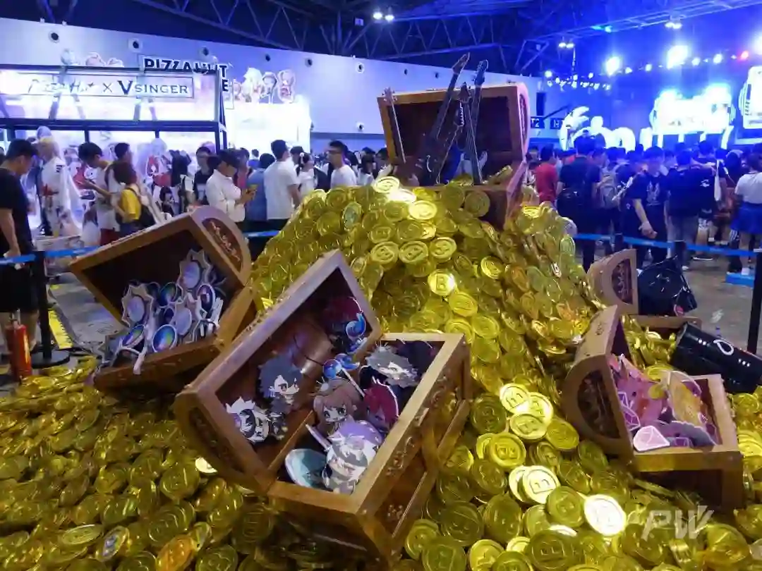 展会上随处可见 b 站元素的道具和摆设,这堆金光灿灿的硬币和宝箱在灯光下尤为瞩目。