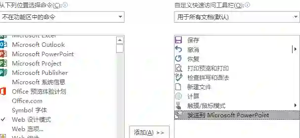 (2)如果“工具栏”里没有这个功能,右键单击”菜单栏“,选择”自定义快速访问工具栏“,选择”不在功能区中的命令“,找到”发送到Microsoftpowerpoint “,点击”添加“,确定即可。