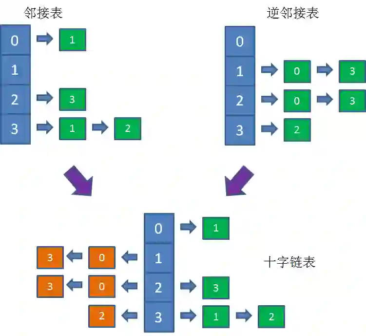 逆邻接表顾名思义,和邻接表是正好相反的。逆邻接表每一个顶点作为链表的头节点,后继节点所存储的是能够直接达到该顶点的相邻顶点。